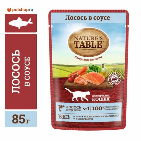 Рацион Nature's Table Лосось в соусе содержит на 100% натуральные ингредиенты самого высокого качества, получаемые от проверенных поставщиков: - Ингредиент № 1 - лосось - богатый источник белка и жирных кислот омега-3, является основой здорового рациона кошки; - Подсолнечное масло и рыбий жир - источники омега-3 и омега-6 кислот, витаминов А, D, E для естественного здоровья кожи и блестящей шерсти; - Натуральные овощи и злаки - источник углеводов и клетчатки, витаминов и минералов для здорового пищеварения, улучшения микрофлоры кишечника; - без сои, искусственных красителей, усилителей вкуса и консервантов. Nature's Table - вся польза природы для вашей кошки, чтобы она радовала вас здоровьем и красотой день за днем! Nature's Table. Полнорационный корм, предназначенный только для взрослых кошек. Рекомендации по ежедневному питанию: масса кошки 2-3 кг - 2-3 пакетика; масса кошки 4-5 кг - 3-4 пакетика; масса кошки 6-7 кг - 4-5 пакетиков. Кормите вашу кошку кормом комнатной температуры. Миска со свежей питьевой водой должна постоянно быть рядом с местом кормления.