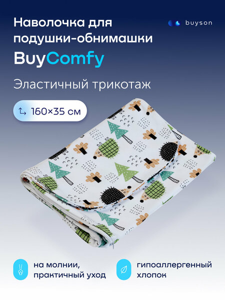 Хотите, чтобы ваша любимая подушка-обнимашка всегда была рядом? Как не расставаться с ней даже на время стирки наволочки? Вам пригодится запасная наволочка для обнимашки! Модель Forest BuyComfy с ярким принтом станет эффектным акцентом в интерьере. Нежный трикотаж из натурального хлопка приятен на ощупь. Подойдет любому, даже аллергикам и людям с чувствительной кожей Наволочка на молнии по всей длине, легко надевается и снимается. Сохраняет яркость цвета, не деформируется, не скатывается после стирки, не дает усадку. Подходит на все подушки обнимашки серии BuyComfy, а также на другие длинные подушки (дакимакура, подушки-валики) размером 160 на 35 см. Также выручит тех, кто купил такую подушку с несъемным чехлом. Особенность подушки-обнимашки – форма валика с мягким наполнителем. Длинная подушка специально разработана для тех, кто не мыслит своего сна без теплых объятий или просто любит спать на боку, закинув ногу на свернутое одеяло. Именно такая поза считается наиболее физиологичной для сна, поскольку максимально разгружает позвоночник. Для новорожденных (0+) этот аксессуар можно использовать как позиционер (барьер безопасности) в кроватку.