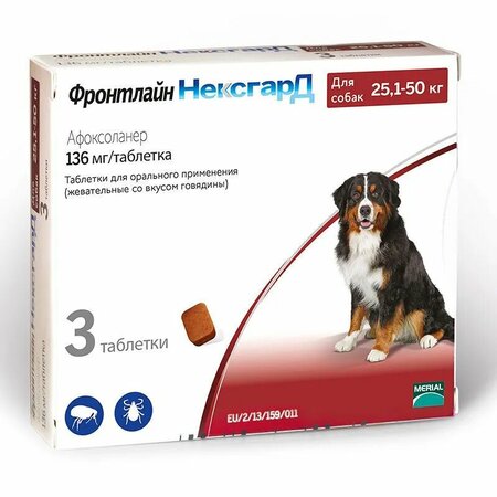 Фронтлайн НексгарД ( 136 ) мг жевательные таблетки от клещей и блох для собак от 25,1 до 50 кг 3 шт. в уп, 1 уп.