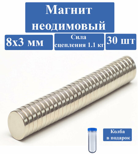 Неодимовые мощные магниты диски в наборах: 8х3мм-30 шт. в тубе. Внимание ! Магниты не монолитны, могут расколоться при неаккуратной распаковке, а так же отсоединение от группы и ударе о метал или другой магнит . Неодимовые магниты довольно хрупкие и при притяжении друг к другу могут сколоться. Марка сплава N 38. В быту магнит помогает- отыскать иголки на ковре или паласе; намагнитить воду; устранить накипь в отопительных трубах; закрепить кухонные предметы (ложки, вилки, сковородки). Круглые неодимовые магниты работают при температуре от -60 до 80 0С, размагничивание 1% в 10 лет. Магнитный момент: сплав железа бора и неодима твердый, но хрупкий. Магнит плоский круглый. Мужские магниты и мощные магниты. Намагниченность аксиальное. Антикоррозийное покрытие Никель.