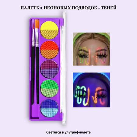 Хочешь яркий и выразительный взгляд? Обрати внимание на этот набор цветных подводок! Красивая палитра позволит тебе создавать новый макияж каждый день под любой образ и настроение. Десять неоновых оттенков помогут воплотить в жизнь самые необычные идеи. Тонкая стрелка днем или смелый насыщенный мейк вечером - выбор за тобой! Ведь неон — это тренд, который по-прежнему актуален! А ровный и аккуратный контур подчеркнет красоту каждой обладательницы наборчика. Все цвета высоко пигментированные, а часть (отмечены на фото) светятся в ультрафиолете. Поэтому ты точно станешь центром внимания на вечеринке или в ночном клубе. Декоративная косметика с эффектом сияния также отлично подходит для создания аквагрима или арт-макияжа для лица и тела. Средство на водной основе, поэтому добавь совсем немного воды в нужный цвет и набери его кисточкой. Кисть идет в комплекте и поможет контролировать интенсивность и толщину линий, а также быстро нарисовать идеальные стрелки, которые не размажутся в течение дня. Смыть их легко, водой или любым средством для снятия макияжа. Сухая подводка - стойкая и достойна положительных оценок даже профессионального визажиста. Она будет держаться до 12 часов и не потускнеет после высыхания. А как насчет оригинального и недорогого подарка для девушек? Порадуй любимую подругу или подростка, который хочет выделяться из толпы! Ведь пигмент будет выглядеть ярко даже поверх теней. Разноцветная сияющая палитра сделает твой образ сногсшибательным!