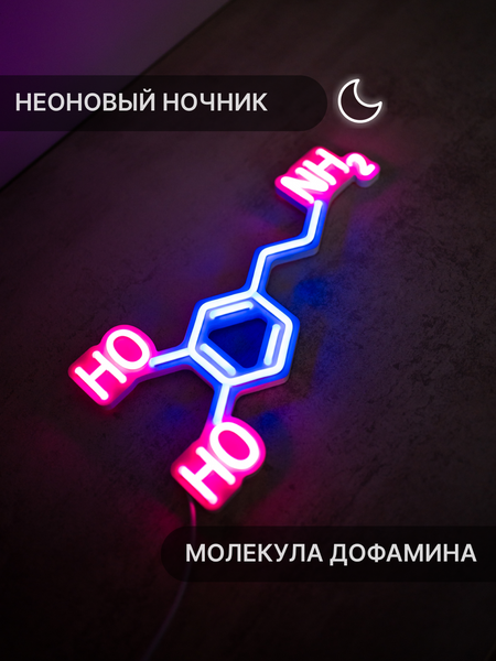 Декоративный неоновый светильник ручной работы на подложке из белого пластика. Сделан из гибкого небьющегося светодиодного неона толщиной 6 мм. Силиконовая оболочка неона устойчива к механическим повреждениям. Толщина подложки 10 мм. Размер ночника 30х15 см. За счет своей формы светильник можно поставить на полку или повесить на стену за петельки. Светильник работает от USB (длина шнура 1 м). 7 режимов свечения. Светильник рассчитан на подключение к блоку питания или зарядному устройству с разъемом USB 5V(вольт) и не менее 2A(ампер). Во избежание повреждений не рекомендуется подключать светильник к разъему компьютера, блоку питания или зарядному устройству меньшей мощности, а также других, не рассчитанных на обеспечение необходимым питанием, устройств. Такой светильник-ночник подойдет любителям химии и биологии, а также тем, кто просто хочет немного повысить уровень гормона счастья! Изделия из гибкого светодиодного неона имитируют газовые неоновые ретро-вывески. При этом экологичны и безопасны. Их можно вешать в спальне, детской или холле. Неоновые вывески сделают любой интерьер ярким и запоминающимся. Светильник ручной работы сделан в русской мастерской Elmarto. В отличии от массового производства мы уделяем большое внимание мелочам. У каждого светильника есть свой автор и мастер, чью бирку вы увидите на изделии. Приятных вам покупок!