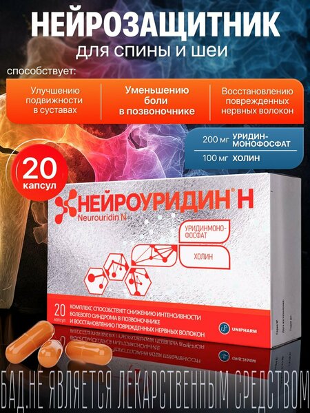 Нейроуридин Н нейропротектор. Уридинмонофосфат и холин для снижения болевого синдрома в позвоночнике и восстановления поврежденных нервных волокон. 20 капсул
