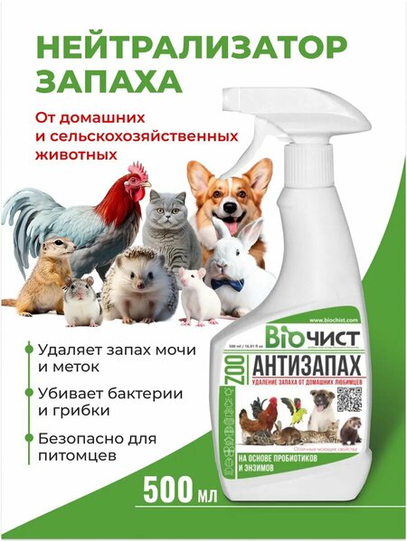 Нейтрализатор запаха Биочист антизапах Зоо - это натуральный эффективный очиститель и поглотитель неприятных запахов от домашних и сельскохозяйственных животных. Форма упаковки представляется в виде спрея распылителя, емкостью 500 мл. Экологическое средство от запаха животных станет настоящей находкой для каждого владельца и незаменимым помощником для всех тех, кто хочет создать комфортные условия для себя и своих питомцев. Наш блокатор запаха животных нейтрализует неприятные ароматы, не разрушает поверхности и не требует смывания. Устранитель запахов животных эффективно поглощает запах мочи животных, крови, фекалий, рвотных масс, меток кошек и собак. Не маскируя их, а полностью устраняя. Ликвидатор запаха имеет безопасный состав натуральные отдушки Европейского производства, который не оказывает вредного воздействия на здоровье ваших питомцев. Поглотитель запахов не содержит агрессивных химических веществ и не вызывает аллергической реакции ни у человека, ни у животного. Пробиотики, входящие в состав чистящего средства разрушают органику, даже в самых труднодоступных местах, перерабатывая ее на воду, углекислый газ и сухой остаток без запаха! Бактерии пробиотики не опасны и не патогенны. Выделены из природы, для них источник запаха - это пища. Мощный деструктор адсорбер навсегда связывает органические молекулы неприятных запахов и не дает им раскрыться вновь. Биоферментные препараты, входящие в состав антизапаха, имеют продолжительное действие работы микроорганизмов, которые используют зловонную органику как пищу. Блокатор запаха животных можно добавлять для стирки одежды животных, тканевых подстилок и др, 50 - 100 гр при температуре не выше 40С. Для экономии средств 30%, советуем приобретать бутылки емкостью 1000 мл. Все средства производятся в России, соответствуют всем экологическим требованиям и имеют сертификаты соответствия. Наше производство всегда следит за качеством выпускаемой продукции. Будем рады вашим отзывам! С Уважением, команда биочист.