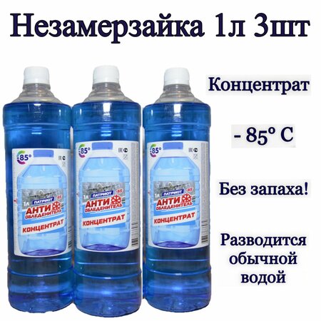 НЕ употреблять внутрь! Беречь от детей! Концентрат антиобледенитель 1 л, 3 штуки. Для получения готового зимнего не замерзающего раствора с температурой использования до -20°С необходимо налить 1 л концентрата и остальной объем расширительного бачка заполнить обычной водой, или смешать 1 л концентрата + 3 л воды. Для температуры до -10° смешать 0,5 л концентрата + 3,5л воды. Зимняя жидкость Концентрат Антиобледенитель Патриот 1 л -85° для эффективного и безопасного применения при очистке стекол автотранспорта в зимний период. Стеклоомывающая жидкость быстро растворяет наледь, снег, удаляет солевой и дорожный налет, делая стекло кристально прозрачным. Концентрат незамерзающей жидкости для омывания стекол автомобиля предназначен для эффективной очитки лобовых, боковых, задних стекол и фар автомобиля при отрицательной температуре окружающей среды. Незамерзайка эффективно удаляет снег, изморозь и загрязнения. Стеклоомыватель не оставляет белесых разводов на стеклах и защищает от царапин. Облегчает движение стеклоочистителей и предотвращает их примерзание. Незамерзайка заливается в бачок омывателя лобового стекла и омывателя фар согласно рекомендациям производителя автомобиля. Добавляется в бачок в чистом виде или разводится согласно инструкции. Товар сертифицирован.