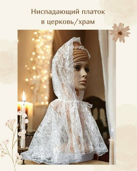 Ниспадающий платок на голову для храма, церкви белый | Накидка-капюшон из гипюра "Нежная" Прекрасный ниспадающий платок весьма популярен у православных женщин. Неспадающий платок имеет большой размер, что позволяет покрыть голову и плечи и использовать его как капор или капюшон. Православный платок на завязках, надежно фиксируется на голове и не спадает. Нарядный христианский платок идеально подойдет для посещения церкви, храма, монастыря и религиозных обителей. Церковный платок будет неотъемлемым аксессуаром в таинстве крещения, на свадьбе, пасхе, рождества, благовещения Пресвятой Богородицы, день Святой Троицы и других православных праздниках. В сочетании с любовью к русским традициям все это создает столь универсальный аксессуар на каждый день, а еще он может стать отличным подарком Вашей маме, бабушке, сестре, подруге, коллеге, любимой жене, теще, свекрови. Размер платка универсальный, подойдет и девочке, и взрослой женщине. ✅ Материал - гипюр (мягкий), кружево ✅ Длина сзади от резинки (горловина) до края - 37 см ✅ Длина спереди от резинки (горловина) до края - 26 см ✅Застежка - завязки-ленточки .