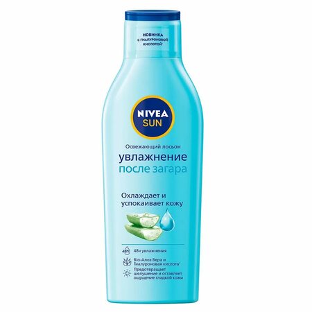 Так здорово, что есть средство, способное освежить кожу от воздействия солнца после прогулки или похода на пляж. Лосьон для тела NIVEA Sun Увлажнение после загара с Bio- Алоэ Вера и Гиалуроновой кислотой* обладает освежающим эффектом, так необходимым после загара. Успокаивает и увлажняет на 48 часов. Легкая ухаживающая и увлажняющая формула с Bio- Алоэ Вера и Гиалуроновой кислотой* помогает восстановить потерю влаги кожи, предотвращает шелушение, чтобы загар оставался красивым надолго, оставляет ощущение гладкой и шелковистой кожи. Легкая формула не оставляет липкости на коже, быстро впитывается, восстанавливая вашу кожу и сохраняя загар ровным. Применение: Наносите на кожу равномерно после загара. Используйте повторно каждый раз при ощущении сухости кожи. Дерматологически протестировано. *В форме гиалуроната натрия