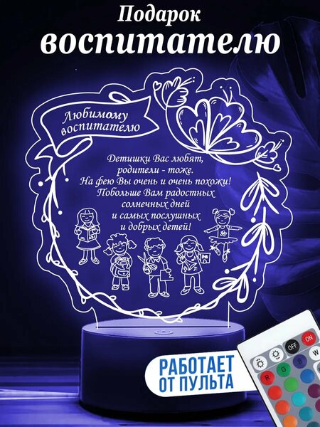 3D ночник – оригинальный подарок для любимого воспитателя на день рождения (ДР), 8 марта, Юбилей или на Новый Год (НГ). Таким красивым сувениром можно выразить благодарность дорогой нянечке или воспитателю детского сада на выпускной от малышей и их родителей. Светильник выполнен из качественного органического стекла, и на дизайн-пластину нанесена гравировка, которая при переливании цвета создает уникальный эффект 3D. В ночнике 16 цветов свечения, 7 уровней яркости и режим плавного переливания цвета, которые создают уникальную атмосферу в комнате. Смена режимов и цвета, а также регулировка яркости осуществляется с помощью пульта дистанционного управления и сенсорной кнопки. Питание ночника осуществляется от 3-х батареек АА (в комплект не входят), а также от USB кабеля (входит в комплект). Ночник безопасен в использовании, он не нагревается при работе и не разбивается на осколки при случайном падении. Светильник упаковано в красивую подарочную упаковку. Добавьте поздравления, и это лучший подарок няне на день Воспитателя и на 1 сентября.