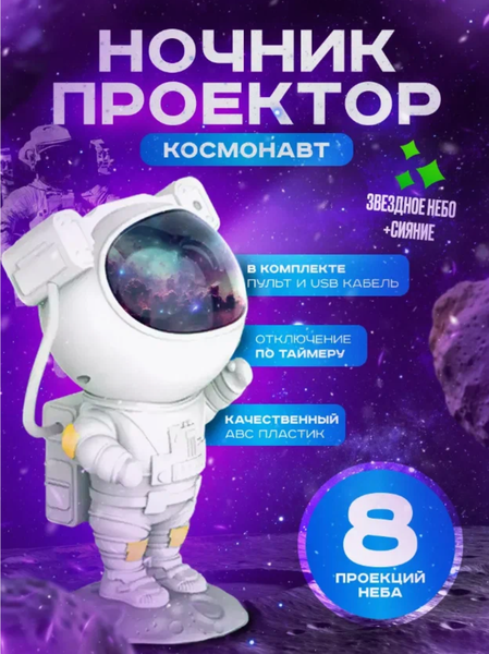 Ночник космонавт — это светодиодный проектор, который изображает на потолке комнаты проекцию космоса, планеты, галактики и создаёт успокоительное освещение. Он является не только функциональной и удобной лампой, но и уникальным предметом интерьера, который передаст неповторимый уют и атмосферу загадочности в ваш дом. Светодиодная лампа проектора воссоздает ночное небо с его великолепными звездочками и туманностью. Пусть ваши малыши наслаждаются восхитительным зрелищем, глядя на световое шоу, которое проецирует этот прожектор прямо на потолок или стены комнаты и создает ощущение погружения в космос. Этот подарочный потолочный ночниксветильник очень компактный и идеально подходит в качестве подарка на день рождения, старый новый год, рождество, рождение ребенка или другой праздник для любимого человека. Он порадует не только детей, но и взрослых, добавив в вашу спальню или гостиную атмосферу романтики. Вы можете подарить светомузыку любому мужчине и женщине, парню и девушке, подруге и другу. Он подойдет абсолютно всем! Такой девайс заменяет блютуз колонку для музыки. Светящийся ночникпроектор оснащен двумя динамиками и воспроизводит музыку в формате MP3 с карты памяти или прямо с вашего телефона через Bluetooth. Магическая цветомузыка светит многими цветами, а также оснащен пультом дистанционного управления, с помощью которого можно выбрать режим отображения туманности, яркость и даже установить таймер, чтобы светильник автоматически выключился через определенное время. Это особенно удобно, когда вы хотите позволить своему ребенку заснуть под сказочное космическое зрелище. Так же оснащён регулировкой цвета и яркости. Выполнен из качественного пластикового материала, который обеспечивает долговечность и безопасность использования. Помимо своей эстетической привлекательности, это украшение работает от сети и является энергосберегающим. Он также может создать особую обстановку для вечерних посиделок с друзьями или романтического свидания с любимым человеком.