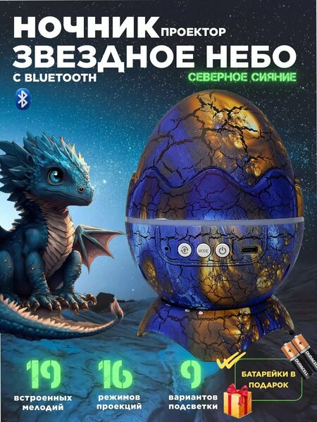 Белый шум; Bluetooth колонка; 16 видов проекций Детский ночник проектор звездное небо от G-House Яйцо дракона с белым шумом подарит Вам и вашему ребенку удивительное путешествие в открытый космос или другую галактику. В 16 различных цветах данный проектор создаст эффект полного погружения в атмосферу звездного неба и полярного сияния. 19 типов белого шума для новорожденных помогут расслабиться и защитить сон малыша. Днем устройство может послужить декором и украшением для дома – современной игрушкой для детской комнаты, вечером - функциональным светильником или ночником для гостиной и спальни. Проектор звездного неба отлично подойдет в качестве детского подарка на день рождения, новый год, 8 марта и 23 февраля, рождество и другие семейные праздники. Также ночник будет приятно получить в подарок и взрослым (любимой девушке, маме, сестре, подруге или другу) -он поможет отвлечься от повседневных забот и создать подходящую атмосферу для любых событий. При помощи функции Bluetooth Вы сможете включить любые музыкальные композиции, подключив его к смартфону. Ночник-светильник работает от розетки, управляется пультом ДУ или кнопками на устройстве, и имеет функцию автоматического отключения по таймеру. Лазерный ночник-проектор позволяет устанавливать цвет и яркость как проекций, так и звёздное небо, скорость вращения изображений, а также громкость мелодии и белого шума. Благодаря современному механизму, он позволяет проецировать качественные изображения как в маленьких, так и в больших помещениях. Использование включенного ночника под крышкой подарит приглушенный свет и красивые светящиеся очертания на Вашем "яйце динозавра". В комплекте к устройству идут все необходимые комплектующие и инструкция на русском языке. Проэктор сертифицирован и безопасен для использования. Будем рады, если Вы выберите наши ночники в качестве новогоднего подарка, День святого валентина, 23 февраля, 8 марта, любимым либо просто подарка без повода (символ года). Также предлагаем ознакомиться с другими товарами нашего бренда на странице нашего магазина.