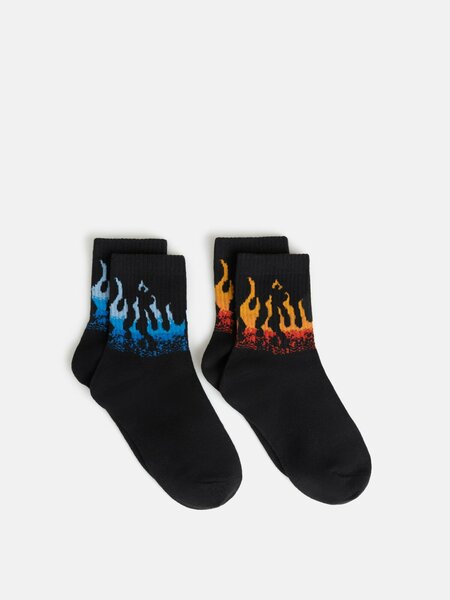 Набор из 2-х чёрных носков для мальчика с ярким огненным рисунком станет стильным дополнением повседневного образа. Модель изготовлена из хлопковой пряжи, что обеспечивает комфорт и хорошую воздухопроницаемость в течение дня. Эластичная спортивная резинка плотно фиксирует носки. Эффектный огненный узор придаёт образу дерзкий акцент. Набор носков отличный выбор для тех, кто хочет добавить яркую деталь в свой гардероб.