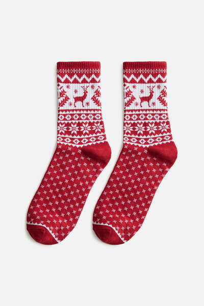 - Высокие женские носки из мягкой, дышащей и очень приятной к телу хлопковой ткани в рубчик - Мягкая эластичная резинка по верхнему краю - Темно-красные носки с белым новогодним узором и оленями / белые носки с красным рождественским узором - Разбавь свои повседневные аутфиты яркими и стильными носками, которые создадут праздничное настроение не только тебе, но и всем окружающим - Идеальный подарок на Новый год или Рождество для твоей подруги, девушки, сестры, жены или мамы: порадуй родных и близких практичным и приятным презентом, который никого не оставит равнодушным - Универсальные и стильные носки на каждый день, которые подойдут к любой обуви и подарят тебе чувство комфорта - Милые носочки с оленями подойдут также в качестве удобных спортивных носков для бега, фитнеса или йоги