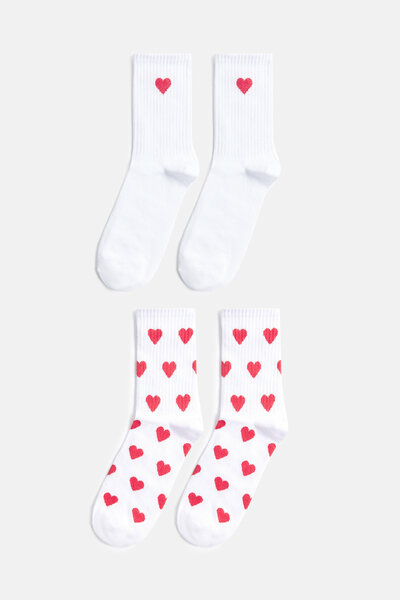 - Набор из двух пар высоких женских носков из легкой, дышащей и приятной к телу хлопковой ткани - Широкая эластичная резинка по верхнему краю - Белые носки с маленьким сердечком / со сплошными сердечками - Самый удобный и практичный набор: дышащие носки на каждый день теперь всегда будут под рукой - Универсальные и удобные высокие носки в комплекте для повседневной носки, которые подойдут к любой обуви и подарят тебе чувство сухости и комфорта на весь день - Подойдут также в качестве удобных спортивных носков для бега, фитнеса или йоги, домашних носков или носков для сна