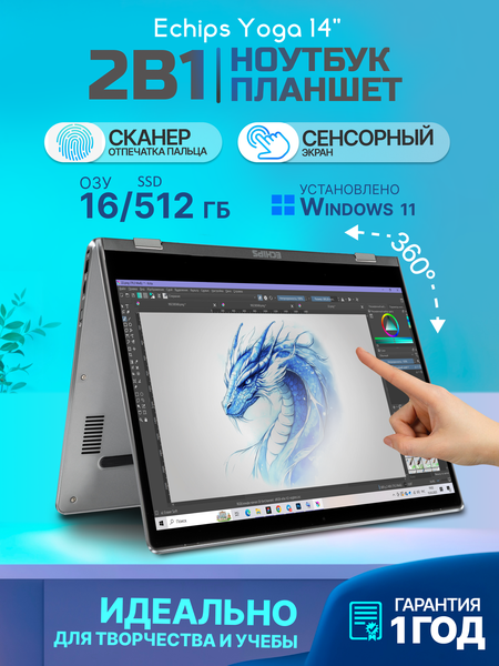 Быстрый и стильный ноутбук трансформер с сенсорным экраном Echips Yoga. Идеально подойдет для тех, кто хочет получить высокую производительность. Ноутбук Echips Yoga оснащен всеми необходимыми разъемами: 1 порт USB 3.0, USB Type-C, microSDHC, комбинированный 3.5 мм разъем переходник аудио и микрофона. IPS-экран размером 14-дюймов и разрешением Full HD имеет четкую и натуральную цветопередачу. Данная модель оснащена активной системой охлаждения. Работает от батарейки почти весь рабочий день. Сенсорный ноутбук трансформер поставляется с Windows. Обращаем Ваше внимание: экран матрицы покрыт защитной пленкой, её необходимо снять. Обращаем Ваше внимание: экран матрицы покрыт защитной пленкой, её необходимо снять. Удобный ноутбук для работы и учебы Windows, который подойдет для повседневных задач. Компактные размеры делают его идеальным выбором как ультрабука для работы и учебы. Подсветка клавиатуры обеспечивает комфортное использование в любых условиях освещения. Этот ноутбук маленький, но мощный, благодаря современному процессору и оперативной памяти. Большой объем накопителя позволяет хранить важные данные без ограничений. Устройство подходит для тех, кто ищет ноутбуки с операционной системой, оптимизированной под повседневное использование. Экран диагональю 14 дюймов дает четкое изображение и комфорт при длительной работе с ноутом. Его эргономичный дизайн делает работу приятной и удобной даже при длительном использовании. Это отличный выбор ноутбука недорогого сегмента с надежными характеристиками. Пользователи оценят производительность ноутбука 16 гб, ведь он оснащен компонентами высокого уровня. Ноутбук мини для работы идеальный выбор на распродаже.