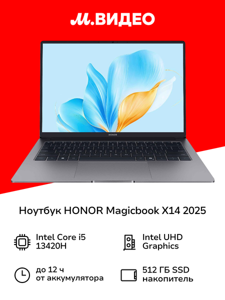 Ноутбук HONOR Magicbook X14 2025/14"/Core i5 13420H/16/512Gb/DOS/Серый (5301ALXL) - компактная модель с экраном диагональю 14 дюймов (35,5 см) разрешением 1920x1200 пикселей. В основе - матрица IPS, которая отличается естественной цветопередачей и высокой яркостью. Частота обновления - 60 Гц. Ноутбук поставляется с операционной системой DOS. • Матовое покрытие дисплея Исключает появление бликов, уменьшает нагрузку на глаза. • Восьмиядерный процессор Intel Core i5 13420H частотой 1,5 ГГц В сочетании с 16 Гб оперативной памяти LPDDR4X обеспечивает быструю работу даже при одновременном запуске нескольких ресурсоемких программ. Под нагрузкой частота может увеличиваться до 4,6 ГГц. • SSD объемом 512 Гб Твердотельный накопитель гарантирует мгновенную загрузку системы и запуск приложений, позволяет хранить большое количество видеороликов, фотографий, документов и прочих файлов. • Intel UHD Graphics Встроенная видеокарта отвечает за качественное отображение графики при решении типовых задач, дает возможность запускать не слишком требовательные современные игры. • Веб-камера 720p Передает четкое изображение при видеосвязи. Ноутбук получил модули Wi-Fi (a/b/g/n/ac/ax) и Bluetooth 5.4 для выхода в интернет, обмена данными с совместимыми устройствами и подключения беспроводной периферии, например, мыши. Интерфейсный ряд представлен разъемом HDMI, портами USB 2.0 Type-A (два) и Type-C, LAN и 3,5 мм для подсоединения наушников или микрофона. Корпус выполнен из пластика. Аккумулятор предоставляет до 12 часов автономной работы.