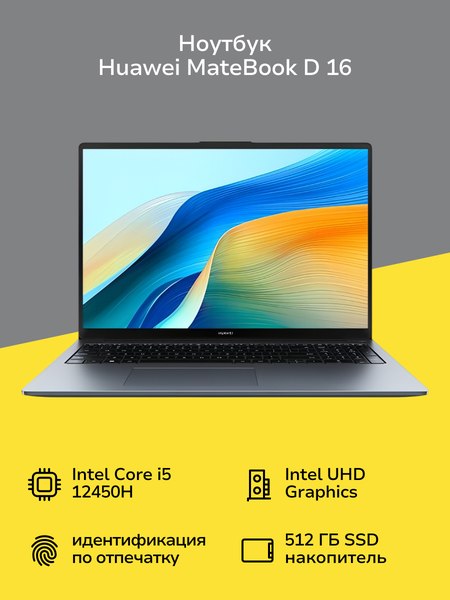 Ноутбук Huawei MateBook D 16 (53013WXE), цвет космический серый под управлением ОС WIndows 11 Home предназначен для решения универсальных пользовательских задач, работы с графической документацией, мультимедиа, нетребовательных онлайн-игр. Устройство в корпусе из алюминиевого сплава габаритами 357х249х18,4 мм (ширина/высота/глубина) и весом около 1,7 кг функционирует на базе восьмиядерного процессора Intel Core i5 12450H (2,0-4,4 ГГц) и видеоядра Intel UHD Graphics. Емкость SSD накопителя - 512 Гб, размер оперативной памяти - 8 Гб. Полуматовый IPS экран диагональю 16,1 дюйма с разрешением 1920х1200 пикселей и цветовым охватом sRGB 100% воспроизводит изображения яркостью до 300 кд/м². Частота обновления кадров составляет 60 Гц, полезная площадь экрана - 90%. Защита от синего света и бликов подтверждена сертификатом TÜV Rheinland. Клавиатура ноутбука с ходом 1,5 мм оснащена кнопкой питания со встроенным датчиком отпечатка пальцев, цифровым блоком, клавишей-модификатором Fn и отзывчивым тачпад. Стереодинамики на боковых гранях корпуса, четыре микрофона с шумоподавлением и отключаемая веб-камера 0,9 Мп с поддержкой искусственного интеллекта обеспечивают двустороннюю связь. Время автономной работы ноутбука без подзарядки - до 8 часов. Для подключения сторонних устройств предусмотрены разъемы HDMI 2.0, USB-C (два), jack 3,5 мм, USB 2.0 Type-A, USB 3.2 Gen-1 и беспроводные антенны Wi-Fi 6 (Metaline), Bluetooth 5.1. Функция Суперустройство в приложении Huawei PC Manager объединяет рабочие пространства ноутбука и гаджетов, обеспечивая быстрый перенос файлов между ними.