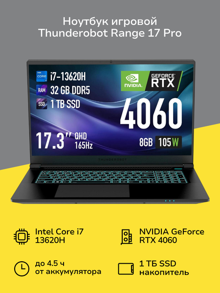 Игровой ноутбук Thunderobot Range 17 Pro JT009600HRU оснащен десятиядерным процессором Intel Core i7 13620H частотой 2,4 ГГц, которая при пиковых нагрузках может увеличиваться до 4,9 ГГц, и 32 Гб оперативной памяти DDR5. Эти характеристики обеспечивают высокую производительность и позволяют запускать современные игры, при желании систему можно ускорить, добавив ОЗУ (до 128 Гб). • Твердотельный накопитель объемом 1 Тб Гарантирует практически мгновенную загрузку, позволяет устанавливать необходимое ПО и хранить внушительное количество игр, фильмов, фотографий и других файлов. • IPS-экран диагональю 17,3 дюйма Обладает разрешением 2560х1440 пикселей, отображает детализированную картинку с высокой яркостью, контрастностью и точной цветопередачей. • Видеокарта Nvidia GeForce RTX 4060 8GB Основана на архитектуре Ada Lovelace, поддерживает ИИ и трассировку лучей. Увеличивает скорость системы, способствует качественному отображению графики. • Звуковая система Intel HD Audio Воспроизводит громкий объемный звук. На клавиатуру нанесены буквы русского и английского алфавитов, клавиши подсвечиваются. Для общения по видеосвязи встроена веб-камера на 1 Мп. Интегрированы выход HDMI, Mini DisplayPort, порты USB 2.0 Type-A, USB 3.2 Type-A (два), USB 3.2 Type-C и 3,5-миллиметровый разъем для подключения наушников или микрофона. Также предусмотрен разъем LAN для проводного интернета. Выходить в Сеть можно и по Wi-Fi. Аккумулятор типа Li-Pol 53,35 В*ч предоставляет до 4,5 часа автономности.