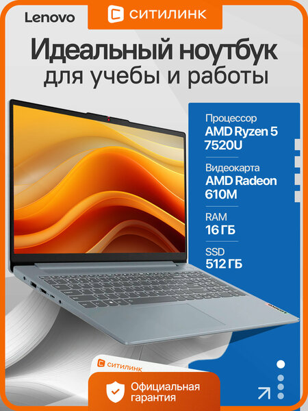 Ноутбук Lenovo IP Slim 3 15AMN8 Ryzen 5 7520U/16Gb/SSD512Gb/610M/15.6/IPS/FHD/noOS/grey
