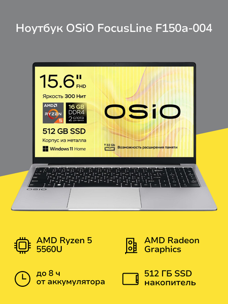 Серый ноутбук OSiO FocusLine F150a-004 произведен в России и работает до 8 ч от аккумулятора емкостью 6000 мА*ч. По бокам стильного металлического корпуса расположены следующие интерфейсы для подключения: вход HDMI, порт USB 2.0 тип A, два USB 3.2 тип A, USB 3.2 тип C, разъемы 3,5 мм для микрофона и наушников, два слота памяти. Устройство оборудовано Web-камерой высокого разрешения 1,9 Мпикс. Установлена ОС Windows 11 Home. Видеокарта Radeon Graphics интегрирована в шестиядерный процессор AMD Ryzen 5 5560U 2,3 ГГц, работающий с максимальной тактовой частотой 4 ГГц. Кэш-память составляет 8 Мб. Объем SSD - 512 Гб. Яркий матовый IPS экран 300 кд/м² с диагональю 15,6"(39,6 см) раскрывается под широким углом. Частота обновления - 60 Гц. Оперативная память DDR4 с частотой 3200 МГц равна 16 Гб. Разрешение - 1920х1080 Пикселей. Модель поддерживает 5G, Wi-Fi версии a/b/g/n/ac и Bluetooth 4.2. Клавиатура с русской и английской раскладкой подсвечивается. В комплекте идет удобный чехол для хранения. Габаритные размеры - 357,7х228,6х18 мм. Вес - 1,7 кг.