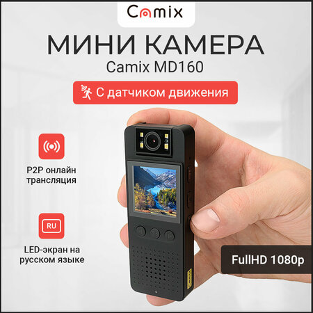 - Поворотный объектив до 180° на торце - Запись качественного FullHD 1080p видео 30fps - Онлайн-трансляция на расстоянии 10-15 метров - Возможность записывать и делать фото трансляции - До 5 часов автономной работы после зарядки - Информативный LED-экран на русском языке - Датчик движения и ночная съёмка - Циклическая запись и установка метки времени - Режимы фотоаппарата и диктофона - Удобная клипса крепление - Поддерживает карты памяти MicroSD до 256 Гб - Инструкция на русском языке в комплекте - Размер 105х38х17 мм. | Вес: 69 гр. - Производитель: Camix Inc. USA - Гарантия: 2 года Новая мини видеокамера Camix MD160 является уникальным устройством, одновременно сочетающим в себе самые востребованные функции, увеличенное время работы, поворотный объектив и информативный LED-экран на русском языке! Камера записывает цветное видео со звуком в разрешении Full HD с сохранением файлов на карту памяти объёмом от 4 до 256 ГБ. Цветной LED-экран позволяет увидеть область съёмки для выбора лучшего положения камеры во время записи, а так же просмотреть записанные материалы. Помимо этого устройство способно транслировать видео онлайн на расстоянии 10-15 метров с просмотром трансляции в бесплатном приложении на мобильном устройстве на базе Android или iOS. По бокам объектива расположены фонарики ночной подсветки для записи видео в темноте. А при активации функции датчика движения камера будет записывать видео только в случае наличия движения перед объективом. Функции фотоаппарата и диктофона пригодятся в ситуациях, когда необходимо сделать качественное фото документов или записать важные переговоры и лекции.