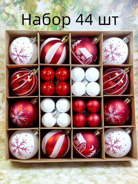 Создайте волшебную новогоднюю атмосферу с нашим набором из 44 праздничных украшений и елочных игрушек! Этот яркий и разнообразный новогодний набор елочных шаров станет настоящим украшением вашей ёлки и дома. В нём вы найдёте 44 уникальных элемента, сочетающих в себе классическую красоту и современный дизайн: блестящие шары и елочные игрушки, и всё, что нужно для создания неповторимого праздничного настроения. Набор на новый год 44 игрушки – достаточно, чтобы украсить даже самую большую ёлку и добавить праздничный блеск всему дому. Набор елочных украшений будет хорошим подарком. Вам не нужно тратить время на подбор отдельных украшений – всё уже собрано в одном наборе. Закажите наш набор новогодних игрушек и шаров и окунитесь в атмосферу волшебства и праздника!