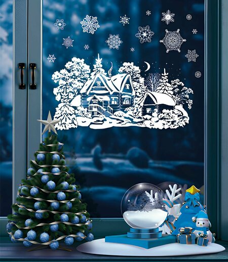 Набор наклеек "Новогодний пейзаж». Отделка пластизоль с блестками (эффект искрящегося снега). Размер листа: 23,7х33 см, на листе 17 наклеек. Размеры наклеек: Домики 31х17см; Снежинки 1,2см (5шт), 1,5см (1шт), 2см (2шт), 2,5см (1шт), 3см (3шт), 4см (3шт), 6см (1шт). Подходят для любых гладких поверхностей: дерево, стекло, металл, пластик, кафель, обои (кроме бумажных). Не оставляют следов. Наклейки двусторонние, многоразовые. Новогодние наклейки украсят помещение и создадут праздничное настроение.
