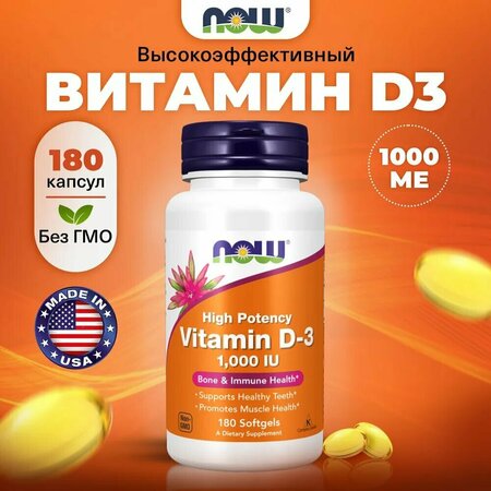 Капсулы с витамином D3 от компании NOW предоставляют этот важнейший витамин в легкоусвояемой жидкой форме. Обычно витамин D попадает в организм из еды либо вырабатывается кожей под воздействием солнечных ультрафиолетовых лучей. Однако в еде он содержится в недостаточном количестве. Поскольку многие люди стараются избежать воздействия солнечных лучей, необходимость в дополнительном приеме витамина D становится все более важной. - в основе препарата быстроусвояемая форма холикальциферола, полученного из ланолина. Рекомендации по применению: по 1 капсуле раз в 2 дня с жиросодержащей едой или в соответствии с рекомендациями врача. Рекомендации по применению: Принимайте по 1 капсуле в день во время еды. Противопоказания: Индивидуальная непереносимость компонентов. Если вы беременны, кормите грудью, принимаете какие-либо лекарства или страдаете каким-либо заболеванием, проконсультируйтесь с врачом, прежде чем принимать какие-либо пищевые добавки. Предупреждения: Хранить в недоступном для детей месте. Не следует превышать рекомендуемую дозировку. Не является лекарственным средством. Комплектация: 1 банка, 180 капсул. Производитель оставляет за собой право изменить внешний вид упаковки, состав продукта, вкусовые добавки и его консистенцию. Мы стараемся следить за изменениями, но, если вы заметили какое-либо несоответствие, пожалуйста, сообщите нам об этом в разделе "вопросы о товаре". Благодарим!