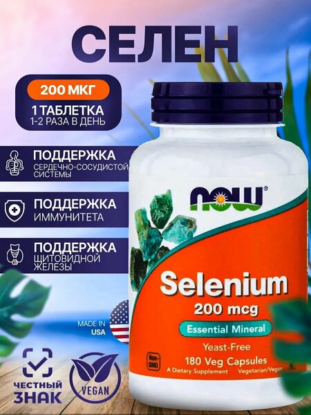 Приемущества Selenium 200 mcg от компании NOW: 1. Селен является важным микроэлементом, который поддерживает множество жизненно важных функций организма. 2. Необходим для производства гормонов щитовидной железы и поддержания её функций. 3. Поддерживает иммунную систему, способствуя её надлежащему функционированию. 4. Помогает защищать клетки от оксидативного стресса. 5. Селен участвует в антиоксидантной деятельности, защищая от свободнорадикального повреждения и воспаления. 6. Способствует здоровью сердца и сердечно-сосудистой системы. 7. Помогает поддерживать когнитивные функции и здоровье мозга. Принимайте по одной таблетке от одного до двух раз в день, желательно во время еды. Противопоказания: индивидуальная непереносимость компонентов(перед применением, рекомендуется проконсультироваться со специалистом).