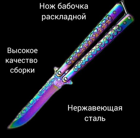 Этот нож-бабочка - это реальный аналог оружия из игры "Counter Strike". Это делает его уникальным в своем роде и настоящие любители "CS: GO" вряд ли смогут пройти мимо. Нож-бабочка или балисонг - это складной нож, который стал очень популярен, так как легко вынимается и раскрывшись, превращается в полноценный нож. Бабочкой он назван, так как в момент очень быстрого верчения и раскрывания этого ножа, лопасти рукоятки похожи на крылья бабочки. Основные преимущества: Высокая прочность используемой при производстве нержавеющей стали; Не является холодным оружием. Главной особенностью данного балисонга является уникальный цвет градиент "CS: GO". Это яркие переливающиеся цвета, которые способны привлечь даже далекого от мира игр человека. Лезвие в раскаленном состоянии, пропитываться краской, благодаря чему, она не сползает при осколах и царапинах. Нож балисонг, нож бабочка, нож градиент, нож складной. Тренировочный нож-бабочка -это специальное езопасное орудие для новичков во флиппинге Механизм складывания балисонга для тренировок полностью идентичен стандартному острому изделию, отличает конструкцию лишь закругленное тупое лезвие. Безопасный гренировочный балисонг исключает риск травматизма при отработке трюков и разработке подвижности пальцев. Его вес немного меньше заточенного снаряда, а габариты слегка увеличены. Нож бабочка тренировочный Нож бабобабочкачка (балисонг) тренировочный нож бабочка нож бабочка тренировочная тренировочный нож Бабочка нож бабочка тренировочная железная нож бабочка настоящий нож бабочка кс го нож бабочка СS: GО тренировочная нож бабочка нож бабочка игрушка для флиппинга нож Standoff 2 ножстендофф 2/ Складной нож Нож бабочка металлический Нож бабочка тренировочный Нож бабочка игрушка Нож бабочка с лезвием Нож бабочка из металламеталла