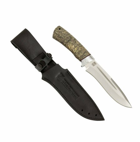 Нож "Беркут" - это высококачественный туристический нож, произведенный на Златоустовском оружейном заводе. Клинок ножа выполнен из ELMAX - высокоуглеродистой стали, что обеспечивает его прочность и долговечность. Благодаря криообработке, клинок обладает высокой твердостью (61-63 HRC), что позволяет ему сохранять свои режущие свойства даже при длительной эксплуатации. Рукоять ножа изготовлена из стабилизированного кап клена, что делает ее прочной и устойчивой к влаге и перепадам температур. Гарда выполнена из алюминия, что придает ножу дополнительную прочность и надежность. Нож "Беркут" поставляется в кожаных ножнах, что обеспечивает удобство хранения и транспортировки. Технические характеристики ножа "Беркут": - Общая длина: 295 мм - Длина клинка: 165 мм - Ширина клинка: 35 мм - Толщина клинка: 3.8 мм - Вес ножа: 224 г Выбирая нож "Беркут", вы получаете надежный и качественный инструмент, который станет незаменимым помощником в любых условиях.