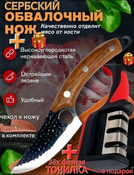 Обвалочный кухонный нож - это лучший инструмент для приготовления пищи как в домашних условиях так и в руках профессионала повара, . Шеф нож обвалочный кухонный -это функциональность, стильный дизайн и высокое качество . Отличный выбор для профессиональных шеф-поваров и всех любителей кулинарии У кухонного обвалочного ножа топорика уникальное V-образное лезвие, что даёт универсальность в работе , так как мм можно и шинковать зелень и дробить мясо и резать фруктами и овощами, а также разделка рыбы . лезвие сербского ножа даёт точность и контроль в исполнении работы по кухне с продуктами питания . Кованый узор ( схожая с ручной ковкой ) на клинке придает этому ножу особый шарм и привлекательность которая добавляет немного стиля в вашу кухню. Кухонный нож обладает твердостью стали 58 НRС что гарантирует его долговечность и отличную заточку. Высоко-углеродистая нержавеющая сталь, из которой сделан клинок, даёт надежность и долговечность ножа. Держит заточку и не будет стачиваться длительное со время благодаря толстому массивному лезвию ножа. Удобная деревянная рукоятка обеспечит надежность и уверенный хват во время работы с ножом. На рукоятке есть специальное отверстие для пальца, что делает его еще более удобным и безопасным в использовании. обвалочный кухонный нож- подарок для шеф-повара и всех любителей готовить. Стильный дизайн ножа и высокое качество. Сербский обвалочный кухонный нож будет незаменимым помощником. Независимо от того, насколько сложными будут ваши рецепты, с этим ножом вам покажется все легко. Обвалочный кухонный нож-это лучший выбор для тех, кто ценителей удобства приготовления пищи Особенности продукта: Подходит для охоты на открытом воздухе и убоя кожи, обрезания и резки толстого мяса Ультра острое лезвие с более широким круглым краем, подходит для решения тяжелых задач 4Cr13 лезвие из нержавеющей стали, не ржавеет, не подвержен коррозии, остается острым в течение длительного времени Полностью прочная ручка tang с 3 заклепками, дизайн для длительного использования Характеристики: Материал лезвия: нержавеющая сталь 4Cr13 Материал ручки: прочная ручка Толщина лезвия: 4 мм Стиль Тан: Полный Тан Дизайн лезвия: полый дизайн, можно держать пальцем Материал оболочки: настоящая 2-я воловья кожа ножеточка настольная кухонная многофункциональная. Металлический точильный станок премиум класса - это инструмент, который должен быть на каждой кухне. Ножеточка предназначена для заточки керамических ножей стальных универсальных столовых, поварских овощных ножей, японских шеф-ножей, сантоку, кухонных топориков, охотничьих складных ножей раскладного туристического ножа бабочки, ножницы Точило имеет четыре зоны с разной абразивностью: 1- для заточки ножниц; 2-вольфрамовая сталь (грубая обдирка) - снимает металл и создает режущую кромку; З -алмазное напыление, с его помощью формируют угол и сглаживают небольшие шероховатости на лезвии; 4 - абразивная керамика для тонкой заточки и шлифовки лезвия. После правящей заточки дольше сохранит остроту лезвия ножа, что позволит без труда нарезать овощи фрукты, сыр, капусту, мясо и рыбу. Аксессуар помогает делать ножи острыми не хуже, чем электрическая заточная машинка. Инвентарь пригодится не только дома, на даче и дачном участке, но также и во время работы или отдыха на природе. Инструм