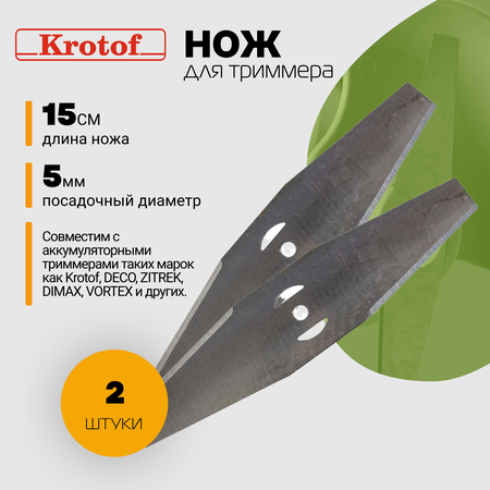 Нож металлический для аккумуляторного триммера CBC02 Krotof изготовлен из высококачественного металла, что обеспечивает его высокую износостойкость и долговечность, по сравнению с пластиковыми аналогами. Нож так же подходит для аккумуляторных триммеров (а так же мотокос) брендов DECO, ZITREK, DIMAX, VORTEX и так далее (обращайте внимание на технические характеристики). Посадочный диаметр составляет 5 мм, что позволяет использовать нож с большинством аккумуляторных триммеров. Длина ножа составляет 15 см. В комплекте поставляется 2 ножа.