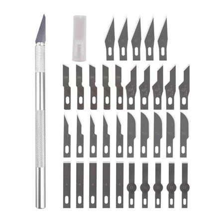 Нож с перовым лезвием - идеальный инструмент для дизайнеров, художников и моделистов. Изделие предназначено для любых художественных и дизайнерских работ. Главное преимущество: отлично режет различные материалы: бумага, фольга, древесина, пластик, ткань и кожа. Лезвие ножа изготовлено из высококачественной инструментальной стали и надежно фиксируется. Металлический корпус ножа обеспечивает долгий срок службы. Замена лезвия осуществляется вручную (в комплекте 35 запасных лезвий). Материал лезвия - инструментальная сталь. Материал корпуса: металл. Длина ручки 115мм, длина лезвия 30 мм. Комплектация: Нож-скальпель в сборе - 1 шт. Лезвие №3 - 5 шт. Лезвие №4 - 5 шт. Лезвие №10 - 5 шт. Лезвие №11 - 5 шт. Лезвие №16 - 5 шт. Лезвие №17 - 5 шт. Лезвие №38 - 5 шт. Лезвия в отдельных пластиковых кейсах.