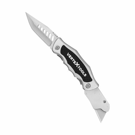 Нож складной VERTEXTOOLS 2в1 универсальный, трапецие-видный предназначен для строительных и хозяйственных работ. Складное универсальное лезвие (для строгания древесины, карандашей и плотных материалов). Трапециевидное лезвие в раскладном держателе (для подрезания кожи, картона, пленки, резины, ковролина)