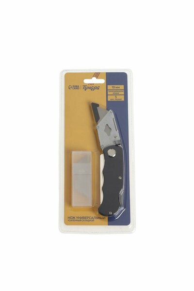 Нож универсальный складной ТУНДРА: надежность и функциональность Высококачественный материал и конструкция Нож изготовлен из прочной стали, что обеспечивает его долговечность и надежность в использовании. Эргономичная металлическая рукоять исключает скольжение в руке, обеспечивая комфортное и безопасное использование. Трапециевидное лезвие и возможность замены Особенностью данного ножа является трапециевидное лезвие шириной 19 мм, которое позволяет выполнять широкий спектр монтажных и ремонтных работ. В комплекте с ножом идут 6 запасных лезвий, что обеспечивает длительный срок службы инструмента. Прочный пластиковый корпус и металлическая направляющая Надежный пластиковый корпус с прочной металлической направляющей увеличивает срок службы инструмента и обеспечивает его устойчивость к механическим повреждениям. Защитная накладка и возможность отламывания лезвия Защитная накладка на лезвии предотвращает случайные порезы и обеспечивает безопасность при работе с инструментом. Возможность отламывания лезвия отсутствует, что гарантирует безопасность и удобство использования. В комплекте с ножом вы получаете 6 трапециевидных лезвий, что позволяет всегда иметь под рукой запасное лезвие для выполнения различных работ.