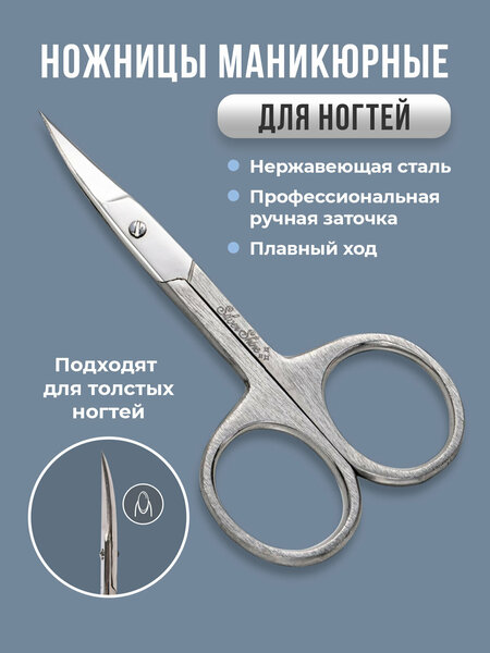 Маникюрные ножницы для ногтей Характеристики: Тип: Маникюрные ножницы для ногтей Материал: Нержавеющая сталь Особенности: Ручная заточка Анатомическая ручка для удобства использования Применение: Используются для обрезки ногтей и мягких тканей вокруг ногтей Описание: Профессиональные ножницы маникюрные — незаменимый инструмент для ухода за ногтями как в домашних условиях, так и в салоне. Представляем вашему вниманию высококачественные маникюрные ножницы , идеально подходящие для точного и аккуратного подрезания ногтей. Эти ножницы маникюрные для ногтей выполнены из прочной нержавеющей стали, что обеспечивает их долговечность и надёжность. Они отлично подходят как для повседневного использования, так и для работы мастеров — ножницы маникюрные для ногтей профессиональные выдерживают интенсивную эксплуатацию и сохраняют остроту лезвий на протяжении длительного времени. У нас вы найдете ножницы маникюрные мужские и модели для женщин, а также специальные маникюрные ножницы для левшей , которые обеспечивают комфортный хват и точное управление. Также в ассортименте представлены маникюрные ножницы для ногтей мужские , отличающиеся прочностью и удобством в использовании. Выбирая наши маникюрные ножницы для ногтей , вы получаете универсальный инструмент, сочетающий в себе эргономику, стиль и качество. Это идеальные ножницы для ногтей маникюрные , которые подойдут каждому — от новичков до опытных мастеров. Убедитесь сами — ваши ножницы маникюрные профессиональные станут любимым инструментом в уходе за ногтями!