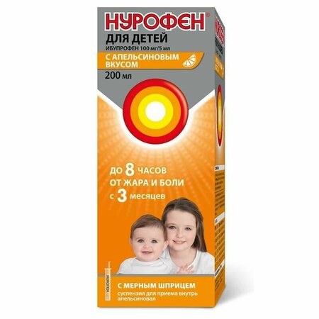 Нурофен для детей — суспензия, специально разработанная для детей. Пациентам с повышенной чувствительностью желудка рекомендуется принимать препарат во время еды. Только для кратковременного применения. Внимательно прочитать инструкцию перед приемом препарата. Перед употреблением тщательно взболтать флакон. Для точного отмеривания дозы препарата прилагается удобный мерный шприц. 5 мл препарата содержат 100 мг ибупрофена или 20 мг ибупрофена в 1 мл. Использование мерного шприца Плотно вставить мерный шприц в горлышко флакона. Перевернуть флакон вверх дном и плавно потянуть поршень вниз, набирая суспензию в шприц до нужной отметки. Вернуть флакон в исходное положение и вынуть шприц, аккуратно поворачивая его. Поместить шприц в ротовую полость и медленно нажимать на поршень, плавно выпуская суспензию. После употребления промыть шприц в теплой воде и высушить его в недоступном для ребенка месте. Лихорадка (жар) и боль Дозировка для детей зависит от возраста и массы тела ребенка. Максимальная суточная доза не должна превышать 30 мг/кг с интервалами между приемами препарата 6–8 ч. Дети в возрасте 3–6 мес (вес ребенка от 5 до 7,6 кг) — по 2,5 мл (50 мг) до 3 раз в течение 24 ч, не более 7,5 мл (150 мг) в сутки. Дети в возрасте 6–12 мес, (вес ребенка 7,7–9 кг): по 2,5 мл (50 мг) до 3–4 раз в течение 24 ч, не более 10 мл (200 мг) в сутки. Дети в возрасте 1–3 года (вес ребенка 10–16 кг): по 5 мл (100 мг) до 3 раз в течение 24 ч, не более 15 мл (300 мг) в сутки. Дети в возрасте 4–6 лет (вес ребенка 17–20 кг): по 7,5 мл (150 мг) до 3 раз в течение 24 ч, не более 22,5 мл (450 мг) в сутки. Дети в возрасте 7–9 лет (вес ребенка 21–30 кг): по 10 мл (200 мг) до 3 раз в течение 24 ч, не более 30 мл (600 мг) в сутки. Дети в возрасте 10–12 лет, (вес ребенка 31–40 кг): по 15 мл (300 мг) до 3 раз в течение 24 ч, не более 45 мл (900 мг) в сутки. Продолжительность лечения — не более 3 дней. Не превышать указанную дозу. Если при приеме препарата в течение 24 ч (у детей в возрасте 3–5 мес) или в течение 3 дней (у детей в возрасте 6 мес и старше) симптомы сохраняются или усиливаются, необходимо прекратить лечение и обратиться к врачу. Постиммунизационная лихорадка Детям в возрасте до 6 мес: по 2,5 мл (50 мг) препарата. При необходимости, еще 2,5 мл (50 мг) через 6 ч. Не применять более 5 мл (100 мг) в течение 24 ч.