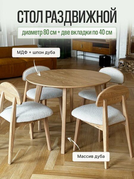 Обеденный раздвижной стол Scandi – красивое и функциональное решение для Вашей гостиной, столовой или кухни. Стол кухонный круглый цвета натурального дерева отлично впишется в интерьер небольшой кухни или дачи в стиле ikea. Идеально подходит для современной кухни в светлых оттенках, благодаря лаконичному дизайну к нему легко подобрать стулья. Наш стол с круглой столешницей под дерево подойдет для больших компаний: расположите его на веранде, балконе или гостиной. Столик в стиле лофт - стильный лаконичный вариант для обеденной зоны квартиры, ресторана и кафе. Столик рабочий подойдет в современный офис, его можно использовать как стол для переговоров, письменный, компьютерный или стол для ноутбука. Столешница дополнительно раскладывается очень легко и просто. Ножки выполнены из массива дуба. Такой стол станет местом притяжения для всей семьи. Диаметр столешницы в различных вариациях для вашего удобства: круглый 80*80 см, овальный 80*120 см, большой овальный 80*160 см.