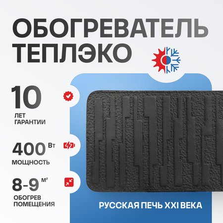 Включенный в сеть обогреватель ТеплЭко обогреватель не только нагревает помещение, но и очищает воздух. Таким образом обогреватель ТеплЭко полезен для вашего здоровья. Кварцевый обогреватель медленно остывает после отключения от сети, работая по принципу русской печи. Кварцевые обогреватели ТеплЭко занимают лидирующее положение на рынке отопительного оборудования с 2010 года. Они экономичны, безопасны, экологичны и долговечны, что подтверждается 10-летней гарантией. Кварцевые обогреватели ТеплЭко с имеют следующие преимущества: Очищение воздуха. Воздух в помещении, где находится кварцевый обогреватель, обеззараживается. Экономичность. Потребляют 400 Ватт в час и долго остывают после отключения от сети. Подключенные через терморегулятор, автоматически включаются и выключаются. Таким образом потребление в сутки составляет 2.5-3.5 кВт. Безопасность. Нагревательный элемент залит внутри монолитной плиты и не соприкасается с воздухом. Таким образом исключена опасность возгорания. Прибор имеет 1 класс пожаробезопасности. Экологичность. Прибор абсолютно безопасен для людей, животных и растений. Надежность. Высочайшая ударопрочность кварцевых обогревателей ТеплЭко достигается за счет металлической рамки. Комфортность. Прибор не сжигает кислород и не сушит воздух. Компактность. Габариты 600х350х25 мм. ТеплЭко можно разместить даже в небольшом помещении. КПД 98%. Практически вся потребляемая энергия преобразуется в тепловую. Характеристики: Объем отапливаемого помещения: 15-18 кубических метров Энергопотребление: 400 Ватт/час Размеры: 600х350х25 мм Вес: 12 кг Рабочая температура поверхности: 95 градусов Цельсия Время беспрерывной работы: не ограничено Комплектация: Силовой электрический кабель длиной 1,5 метра. Оболочка кабеля невоспламеняемая и несгораемая. Три кронштейна для крепления обогревателя к стене. Паспорт изделия (предоставляется один на партию). Фирменная картонная упаковка для безопасной транспортировки обогревателя к месту установки.