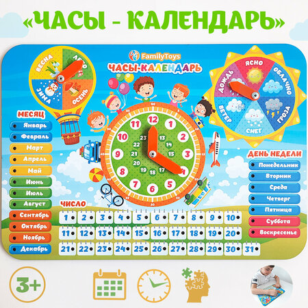 Обучающая игра FamilyToys Часы-календарь учим время, дни недели, времена года, развивающая игрушка 3+, календарь детский