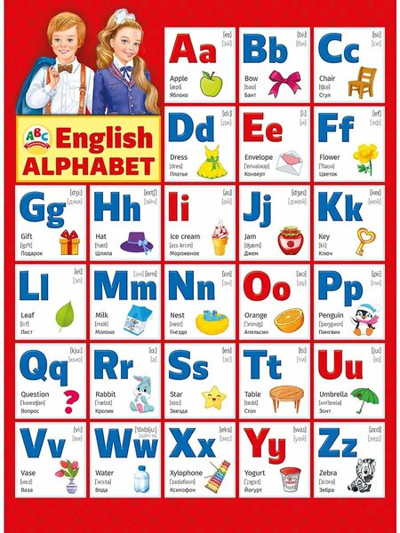 С этими плакатами детям и взрослым будет легче и быстрее запомнить английские буквы и слова! Примеры слов для каждой буквы даются с английской и русской транскрипцией и русским переводом. Каждую букву иллюстрируют яркие рисунки, это помогает развивать зрительную память и облегчает запоминание, поэтому процесс обучения становится более быстрым и эффективным! Красочный плакат «English alphabet» сделает занятия по иностранному языку еще более интересными! Развивающий постер поможет не только в учебе, но и станет отличным украшением дома, группы детского сада или школьного класса. Развивающий оформительский плакат имеет прямоугольную форму и формат А2. Размеры плаката 44х60 см. Обучающий плакат — односторонний, изготовлен из плотного картона. Материал прочный, поэтому плакат не помнется при транспортировке или использовании. Сверху на картонную основу нанесено яркое полноцветное изображение. Благодаря высокому качеству печати краски не выцветут, и постер будет радовать вас многие годы. Он хорошо впишется в любой интерьер! Плакат — широкоформатный, поставляется в свернутом виде. Сразу готов к использованию! Достаточно вынуть его из упаковки, развернуть и прикрепить на стену, мебель, школьную доску или любую другую ровную поверхность. Постер также можно оформить в раме со стеклом. Обучающий плакат подойдет для оформления учебных комнат, классов, коридоров, кабинетов. Он будет актуален для дома, школы, детского сада, языковых центров, факультативов, курсов. Его можно использовать для обучения как детей, так и взрослых. А еще такой настенный плакат станет отличным подарком учителю, педагогу, преподавателю, воспитателю на День учителя, 1 Сентября — День знаний или любой другой праздник. Развивающий плакат Английский алфавит — это полезное учебное пособие для школьников, студентов и всех тех, кто стремится к знаниям. Заказывайте дидактический плакат, изучайте английский язык, развивайтесь!