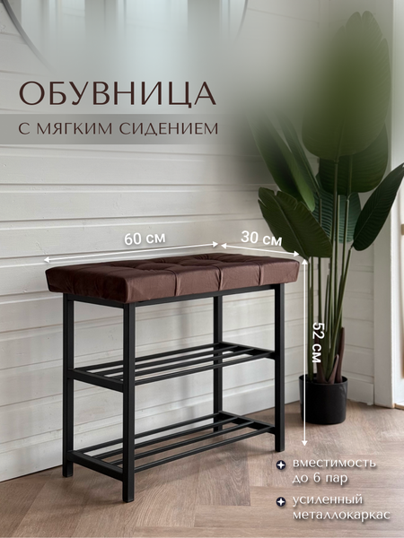 Обувница в прихожую: практичность и стиль Обувница в прихожую с мягким сиденьем и металлическим каркасом представляет собой практичный и стильный мебельный предмет, предназначенный для хранения обуви. Каркас обувницы выполнен из металлических труб или профильной металлической рамы, обеспечивая прочность и устойчивость конструкции. В верхней части полки для обуви располагается мягкое велюровое сиденье, которое позволяет удобно садиться при надевании или снятии обуви. Каретная стяжка придает обувнице элегантный и стильный вид, а высококачественный велюр обеспечивает долговечность и комфорт использования. Размеры обувницы составляют 60х30х52 см, что указывает на ее ширину, глубину и высоту. Это позволяет разместить до 8 пар обуви, а максимальная нагрузка составляет 200 кг. Обувница разборная, что удобно при транспортировке или перемещении. Обувница с металлическим каркасом и мягким велюровым сиденьем в каретной стяжке является практичной и стильной мебелью, которая поможет организовать хранение обуви и придаст интерьеру уютный вид.