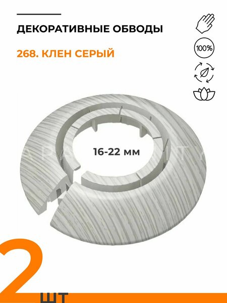 Обводы (розетты) универсальные для труб IDEAL (Идеал) Ø 16-22 мм предназначены для декорирования мест примыкания труб к полу, стене или потолку и придают отделке эстетичный, завершенный вид. Преимущество универсального обвода IDEAL «Идеал»: · Аккуратное оформление места стыка труб отопления с полом, потолком и стеной. · Благодаря замковому соединению, обвод надежно защёлкиваются на трубе · Не слетают при ударах · Сохраняют внешний вид интерьера · Чистый белый, матовый цвет обвода хорошо сочетается с любыми потолками будь они плёночными или тканевыми · Универсальный размер Ø 16-22 мм Монтаж обвода (розетты) универсального IDEAL «Идеал» Ø 16-22мм не требует вспомогательных инструментов, очень прост и занимает всего несколько секунд. Для наглядного примера, видео монтажа обвода представлено в карточке товара. Характеристики универсального обвода IDEAL «Идеал»: · Бренд - IDEAL · Цвет – Клен серый · Материал – Пластик (ПВХ) · Размер обвода – внутренний Ø 16-22мм, наружный Ø 48мм