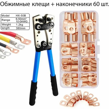 К вашему вниманию набор: обжимной инструмент для обжима кабельных наконечников и качественные обжимные медные клеммы типа ТМ, SC – подойдет для электриков, строителей, для авто и мото техники, всех кто занимается установкой и монтажом проводных систем. Инструмент для обжима кабеля Модель: HX-50B Длина: 39,5 см/15,6 дюйма Размах ручки: 13 см/5,1 дюйма Толщина: 4,2 см/1,7 дюйма Диапазон обжима: 6-50 мм² 1-10AWG Обжимной инструмент HX-50B — мощный помощник для профессионалов и домашних мастеров. Высококачественные материалы гарантируют долговечность и прочность, а удобные рукоятки обеспечивают комфорт в работе. Благодаря вращающимся обжимным матрицам и простому использованию инструменты идеально подходят для обжима различных типов кабелей и наконечников. Не упустите возможность приобрести эти незаменимые инструменты для вашего арсенала! В комплекте кольцевые медные наконечники выполнены из высококачественных материалов, что обеспечивает надежное и долговечное соединение. Обжимные наконечники типа ТМ, SC могут использоваться в кабельных системах для соединения проводов между собой или с другими соединительными элементами. Для достижения наиболее качественного соединения, опрессовка изделия осуществляется при помощи специализированных клещей для обжима в нашем случае это "обжимные клещи для наконечников HX-50B". Премиум Материал: эти кольцевые наконечники изготовлены из высококачественной меди, прочные с хорошей электрической проводимостью, термостойкостью и коррозионной стойкостью, будут служить вам в течение длительного времени Размеры проводки и шпильки, штампованные на клемме. Широко используется в бытовой технике, автомобилях, электротехнической промышленности, механической. Технические характеристики: Количество: 60 шт Тип клемм: SC Тип медные закрытые соединительные клеммы Особенности: Материал: красная медь Размер коробки: 130x66x22 мм Режим подключения: Клеммная колодка евро В комплект входят клемы типа ТМ, SC количеством 60шт. -SC6-6: 10 шт. -SC6-8: 10 шт. -SC10-6: 10 шт. -SC10-8: 10 шт. -SC16-6: 5 шт. -SC16-8: 5 шт. -SC25-6: 5 шт. -SC25-8: 5 шт. 1x пластиковая коробка
