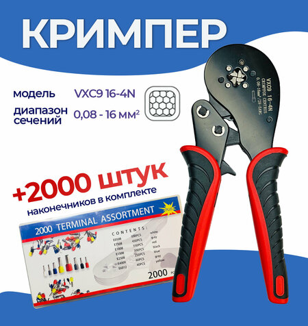 В набор входит комплект наконечников НШВИ популярных размеров (2000шт) и пресс-клещи VXC9 16-4N для их обжима. Пресс-клещи также называют кримпер – это электромонтажный ручной инструмент, предназначенный для соединения кабеля с наконечниками методом опрессовки. Модель кримпера VXC9 16-4N. Корпус из высокопрочной стали оснащен регулятором прижимного усилия матриц. Ширина обжимной матрицы 13мм. Диапазон сечений 0,08 – 16 мм² Четырехгранный профиль обжима. Удобные, нескользящие рукоятки. Наличие храпового механизма, гарантирует полную опрессовку наконечника. Пресс-клещи VXC9 16-4N прочные и простые в использовании. Набор наконечников НШВИ включает в себя следующие наконечники: НШВИ 0,5-8 (E0508) – 550 шт НШВИ 0,75-8 (E7508) – 450 шт НШВИ 1,0-8 (E1008) – 350 шт НШВИ 1,5-8 (E1508) – 300 шт НШВИ 2,5-8 (E2508) – 250 шт НШВИ 4,0-9 (E4009) – 60 шт НШВИ 6,0-12 (E6012) – 40 шт Всего 2000шт
