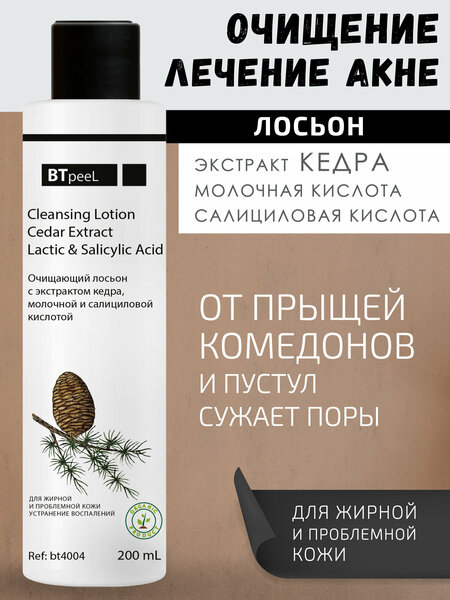 Очищающий лосьон BTpeel выполнят сразу несколько функций: очищает и тонизирует, освежает и улучшает цвет лица, сужает поры, регулирует секрецию сальных желез, устраняет воспалительные элементы. Лосьон содержит целый комплекс активных аминокислот, молочную и салициловую кислоту, что делает его очень эффективным в лечении и профилакетике акне. Высокий процент содержания экстракта алоэ вера и витамин Е увлажняет и защищает кожу от потери влаги. 100% натуральный состав (не содержит парабены, красители и химические отдушки).