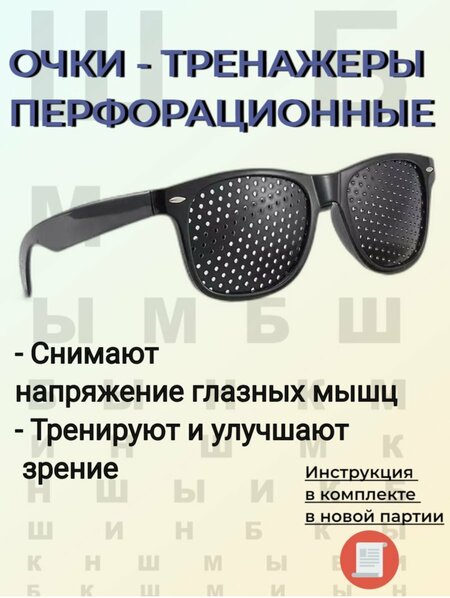 Это специальные очки для коррекции и улучшения зрения, в оправу которых вставлены особые пластины с небольшими отверстиями, расположенными в особом порядке. Вероятно, действие дырчатых очков кажется вам не совсем непонятным. На самом же деле все гениально-просто! Бывает, на приеме у глазного врача врач просит пациента посмотреть сквозь небольшую дырочку на черном диске. Если даже зрение частично потеряно, но через такую дырочку больной видит, в этом случае восстановление зрения возможно без операционного вмешательства. Глаз человека – это своеобразный оптический прибор, следовательно, для него возникают явления рефракции (преломления) светового луча, диафрагмирования (увеличения глубины фокуса) и интерференции (изменения направления) светового потока. Они пригодятся всем тем, чья работа связана с большой нагрузкой на глаза: компьютерщики, сборщики, бухгалтеры, экономисты. В век компьютерных технологий они полезны практически каждому работнику офиса, так как современный рабочий процесс представить без компьютера невозможно. Преимущества Наблюдается существенное снижение близорукости. Снимается спазм аккомодации при различной степени дальнозоркости. Периодическое ношение позволяет улучшать зрение при астигматизме, у многих людей его исправление происходит быстрыми темпами. В связи с возрастом глаза хуже видят, появляется дальнозоркость. Они существенно снижают степень этого возрастного дефекта зрения. Возвращение нормального цветоощущения зрению, длительное время работающее в условиях искусственного освещения. После получасового сеанса краски окружающего тебя мира становятся более яркими и насыщенными. Быстро и эффективно снимают усталость при большой нагрузке на зрение, пропадает ощущение тяжести, жжения, «песка» в глазах. При разной оптической силе глаз корректируют и сглаживают разницу в оптической силе глаз на 3-5 диоптрий. Помогают остановить катаракту, а также способствуют восстановлению зрения после операции. Существенно улучшают переносимость глаукомы и катаракты, приостанавливают развитие других глазных заболеваний. Укрепляют и тренируют мышцы глаз, постепенно возвращая пациенту нормальное зрение. Клинические испытания, проведенные специалистами ведущих офтальмологических кафедр Москвы, подтвердили - они являются лучшим способом избавления от близорукости, дальнозоркости и астигматизма, не требующим хирургического вмешательства. Тренировки глаз с использованием данных безлинзовых очков надо начинать с 5-15 минут 3-4 раза в день, постепенно увеличивая их продолжительность до 30-50 минут. Заниматься лучше вечером, когда особенно хочется сбросить напряжение и восстановить свои силы. Во время тренировок Вы можете, например, смотреть телевизор или читать. Важно лишь обратить внимание на освещение: оно должно быть достаточным. При тренировках избегайте пристального неподвижного взгляда, старайтесь почаще переводить глаза с ближнего предмета на дальний, и наоборот. Регулярно проверяйте состояние своего зрения. Для этого в комплекте есть контрольная таблица. Прикрепите ее на стену, встаньте или сядьте на расстоянии 3,5 метров от нее. Проследите, чтобы освещение было достаточно ярким! Снимите свои очки или контактные линзы, если вы их носите, посмотрите на таблицу, запомните строку букв, котору