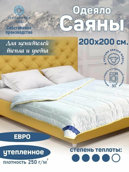Невероятно мягкое и теплое одеяло Саяны торговой марки Территория сна с наполнителем из овечьей шерсти, который отличается высокой терморегуляцией, густотой и приятным светлым тоном, идеальный вариант для мерзнущих людей. Ткань обладает повышенной плотностью, хорошо пропускает воздух, не деформируется и быстро сохнет. Благодаря биоцидной обработке против грибков и клещей изделие является безопасным и подарит Вам незабываемый комфорт во время сна. Ткань: микрофибра, 100% п/э. Наполнитель: овечья шерсть 40%, полиэфирное волокно 60%. Степень теплоты: зимнее.