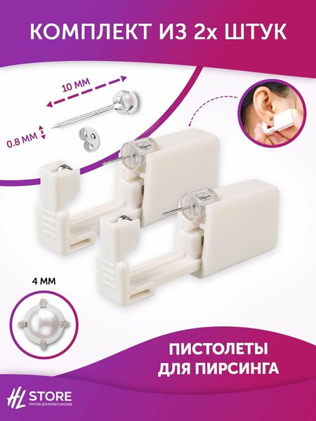 Профессиональный пистолет для пирсинга ушей. В комплекте 2 пистолета Безопасно и безболезненно. Материал пистолета поликарбонат. Материал стержня хирургическая сталь 316L. Пистолет с 1 шт. ушным гвоздиком со стразой на лапках Цвет гвоздика - серебряный Цвет страза - прозрачный Размер камня - 4 мм На 100% абсолютно новый, упакован в специальную стерильную упаковку. Стерилизация по технике окиси этилена. Прост в использовании. Не делает громкого щелчка, как у специалистов, потому этот пистолет не напугает даже маленьких детей! С принципом действия вы разберетесь за пару минут, а главное будете полностью уверены в безопасности и стерильности процедуры! В комплекте идет спиртовая салфетка! Больше для прокола ничего не нужно! Вы полностью готовы к безопасной процедуре.