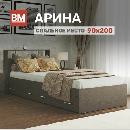 Односпальная кровать с матрасом, Арина 90х200, Венге с ящиками